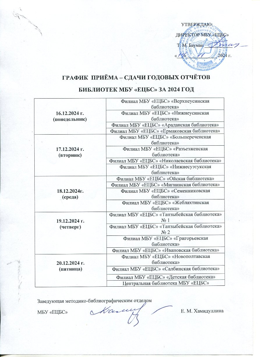 2.09.2024 График приёма - сдачи годовых планов работы муниципальных библиотек Ермаковского района на 2025 год