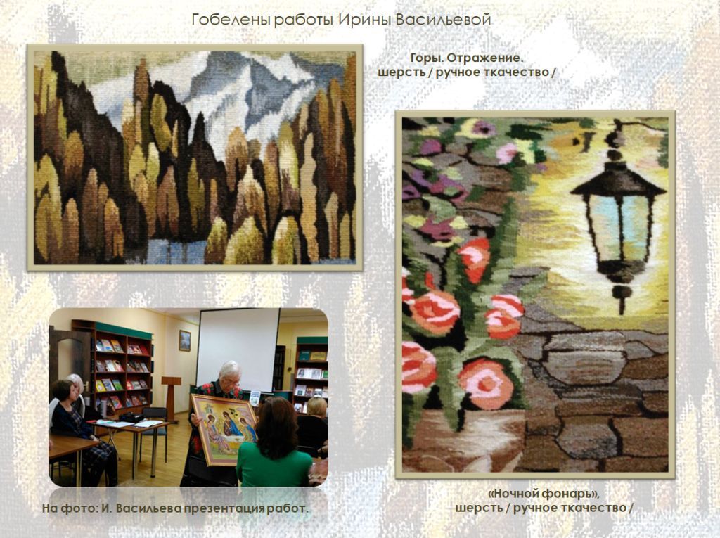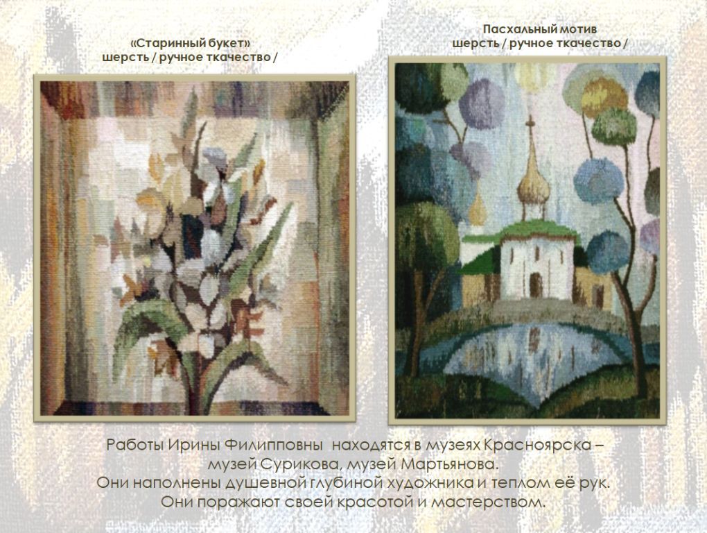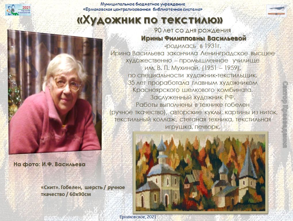И.Ф. Васильева, много лет отдавшая работе на Красноярском шелковом комбинате, в последние годы выступает как мастер гобелена, панно. Ее ковровые изделия отличаются красотой, выразительной ритмичностью. Ее работы обладает глубоким звучным цветовым строем, теплотой и зовут в сказку.