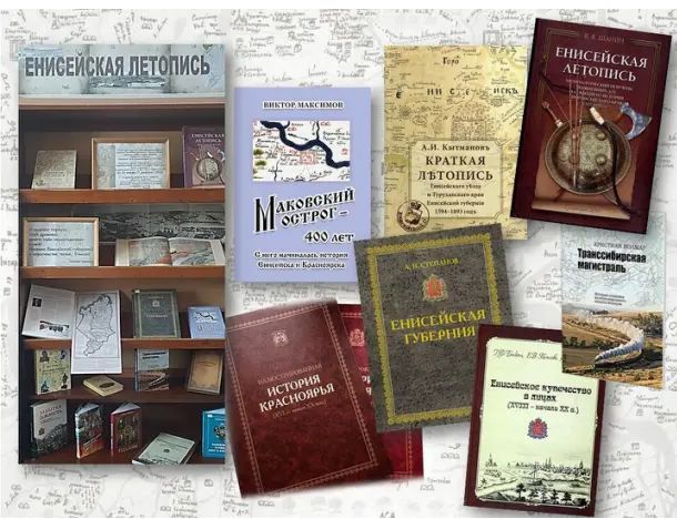 Главная книга выставки — «Енисейская губерния» - это ценное комплексное исследование создано после девятилетнего пребывания на посту первого Енисейского губернатора Александра Петровича Степанова. Обильный полевой материал, собранный во время частых разъездов, знакомство с местными архивами и литературой позволили А.П. Степанову дать яркую по стилю и полную для своего времени характеристику растительного и животного мира, численности, сословного состава и хозяйственно-бытового уклада русского и коренного населения губернии. Книга и в настоящее время имеет большое научное и историческое значение, является библиографической редкостью. Замечательная книга, историко-краеведческое исследование Виктора Максимова «Маковский острог - 400 лет: с чего начиналась история Енисейска и Красноярска».