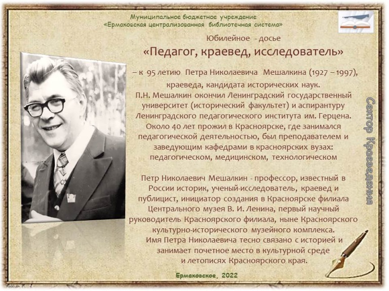 «Педагог, краевед, исследователь» – к 95 летию Петра Николаевича Мешалкина (1927 – 1997), краеведа, кандидата исторических наук.
