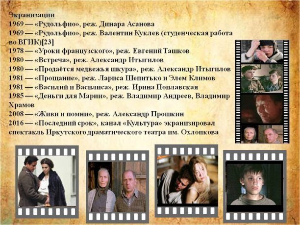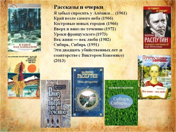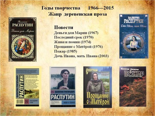 Самыми известными произведениями писателя Валентина Распутина стали повести «Уроки французского», «Прощание с Матёрой», «Пожар», «Последний срок», «Живи и помни».