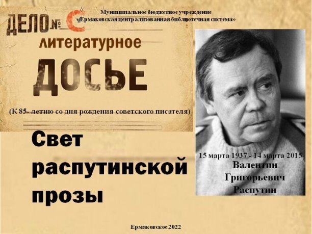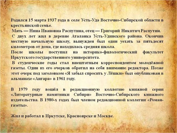 Русский советский писатель и публицист, общественный деятель. Он великий писатель-прозаик, настоящий патриот своей родины. Основатель и самый яркий представитель направления, которое получило название «деревенская проза». «Этого писателя модно читать и перечитывать» – такой комментарий под одной статьей о В. Г. Распутине. Разве можно с этим поспорить? Это бесспорный факт, творчество В. Распутина не может никого оставить равнодушным, оно пронизано стремлением помочь человеку обрести иное видение, поднять его над повседневностью.