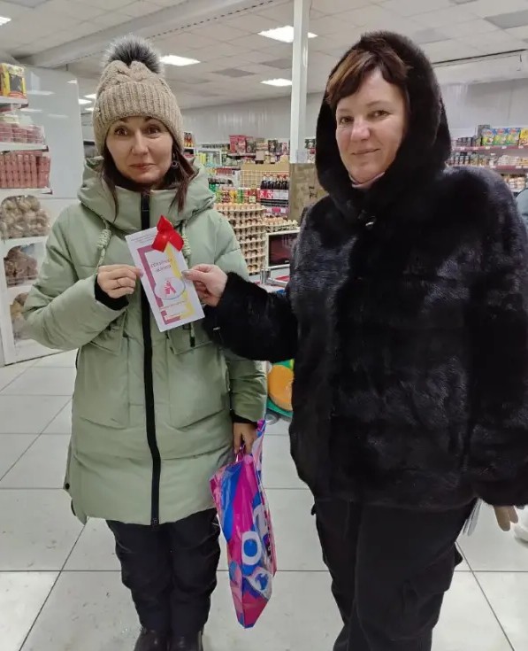 В ходе акции жителям были вручены информационные буклеты, о том , как защитить себя и своих близких от страшной болезни. А так же ленточка цвета крови, свёрнутая петелькой, которая символизирует знак нашего сострадания, поддержки и надежды на лучшее будущее.