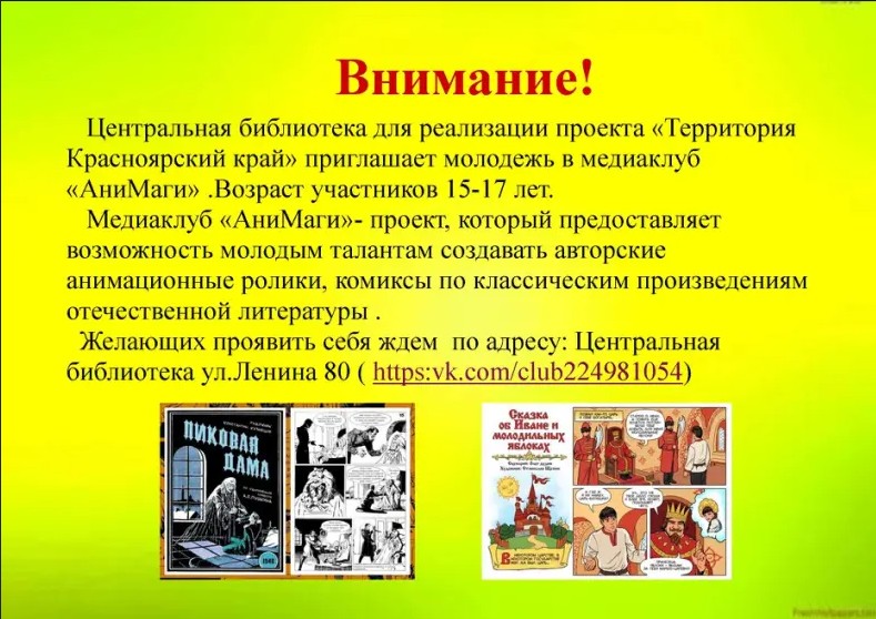 Медиаклуб для молодежи 15-17 лет - это проект, который предоставляет возможность молодым талантам создавать авторские анимационные ролики, комиксы по классическим произведениям отечественной литературы и создание информационного, исторического, познавательного контента.