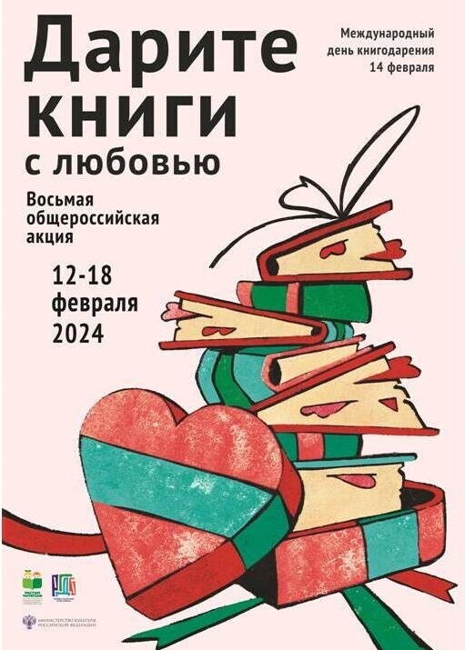 С 12 по 18 февраля 2024 года пройдет Восьмая общероссийская акция «Дарите книги с любовью», приуроченная к Международному дню книгодарения, который отмечается 14 февраля.