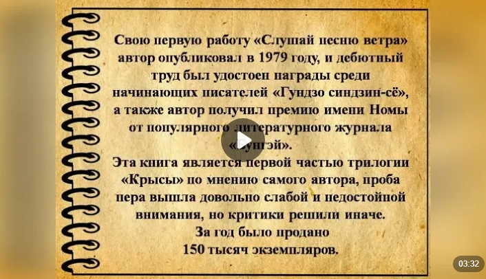 Произведения Мураками переведены на более чем 50 языков мира и имеют массу почитателей как на родине писателя, в Японии, так и за её пределами вы найдете в нашей библиотеке.