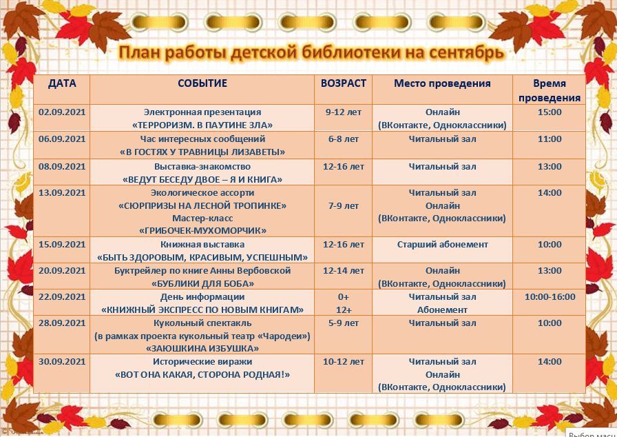 27.08.2021 План работы детской библиотеки на сентябрь
